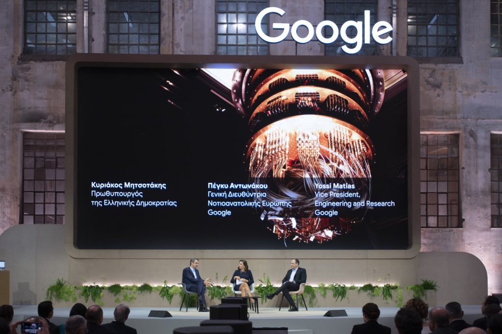 (από αριστερά προς τα δεξιά επί σκηνής): Κυριάκος Μητσοτάκης, Πέγκυ Αντωνάκου – Γενική Διευθύντρια Google Νοτιοανατολικής Ευρώπης, Yossi Matias – VP of Engineering & Research Google