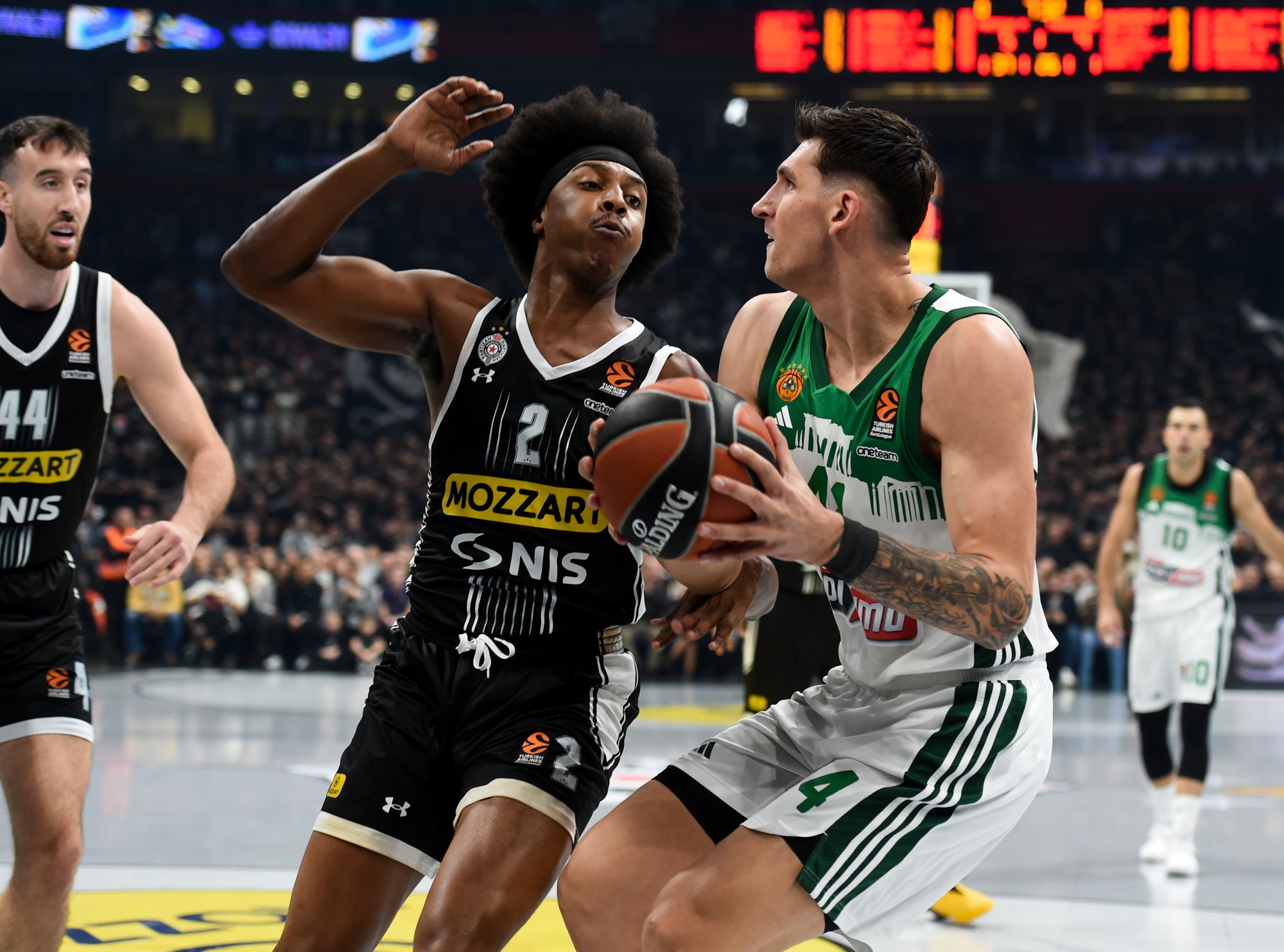 Στο δεύτερο δεκάλεπτο το «τριφύλλι» βρήκε σκορ από τον Ναν που φαινόταν να έχει ρυθμό, με το σύνολο του Ζέλικο Ομπράντοβιτς όμως να κρατά την επαφή του με τον Παναθηναϊκό. Οι Πράσινοι πάντως βρήκαν τον τρόπο να ξεφύγουν και να βρεθούν στο +8 (32-24), εκμεταλλευόμενοι τις κακές επιλογές της Παρτίζαν στο μπροστά μέρος του παρκέ. Οι Σέρβοι είχαν ένα ξέσπασμα όμως με τον ΛεΝτέι να κάνει πολύ καλό ματς, όπως και ο Σμάιλαγκιτς, και έτσι κατάφεραν όχι απλά να ισοφαρίσουν, αλλά να περάσουν και μπροστά με +3 (39-36). Το ημίχρονο έκλεισε με τους Σέρβους να έχουν βραχία κεφαλή χάρη στο 39-38.