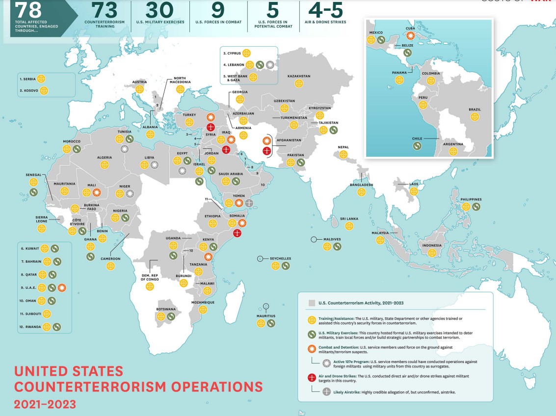 Ο στρατός των ΗΠΑ διεξήγαγε επίσημα, ασκήσεις με στόχους που περιλαμβάνουν την αντιτρομοκρατία σε 30 χώρες. Ο αριθμός αυτός περιλαμβάνει νέες χώρες και αποκλείει άλλες που βρίσκονταν στον προηγούμενο χάρτη.