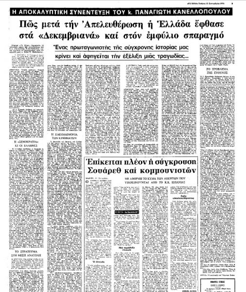 *Εκτενές απόσπασμα από αποκαλυπτική συνέντευξη που είχε παραχωρήσει ο Παναγιώτης Κανελλόπουλος στο δημοσιογράφο και συγγραφέα Βάσο Μαθιόπουλο (1928-2013) αναφορικά με το πώς οδηγήθηκε η χώρα μας αμέσως μετά την Απελευθέρωση στα Δεκεμβριανά και στον εμφύλιο σπαραγμό. Η συνέντευξη του Κανελλόπουλου είχε δημοσιευτεί στην εφημερίδα «Το Βήμα» την Τετάρτη 15 Σεπτεμβρίου 1976.