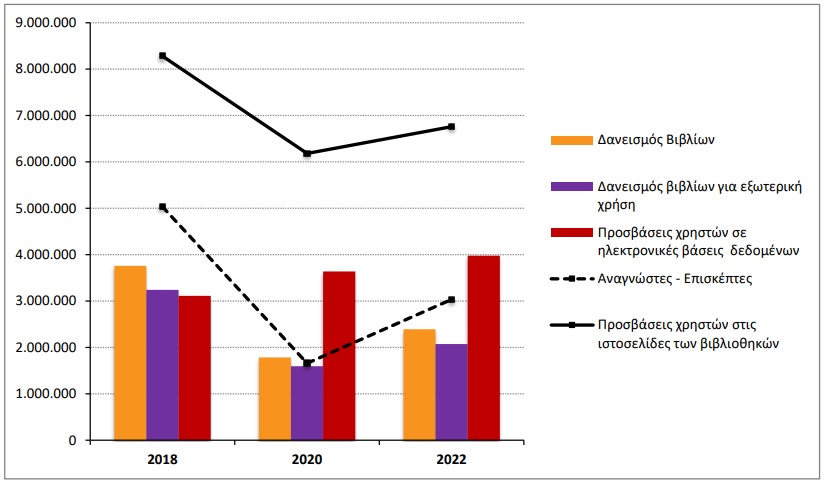 Αναφορικά με την αναγνωστική κίνηση και τον δανεισμό στις βιβλιοθήκες, κατά τη σύγκριση των ετών 2022 προς 2020 παρατηρείται αύξηση κατά 83,1% στον αριθμό των αναγνωστών – επισκεπτών, κατά 34,3% στον αριθμό των δανεισθέντων βιβλίων, κατά 30,0% στον δανεισμό βιβλίων για εξωτερική χρήση, κατά 9,3% στον αριθμό πρόσβασης χρηστών σε ηλεκτρονικές βάσεις δεδομένων και κατά 9,4% στον αριθμό πρόσβασης χρηστών στις ιστοσελίδες των βιβλιοθηκών.