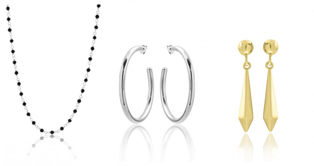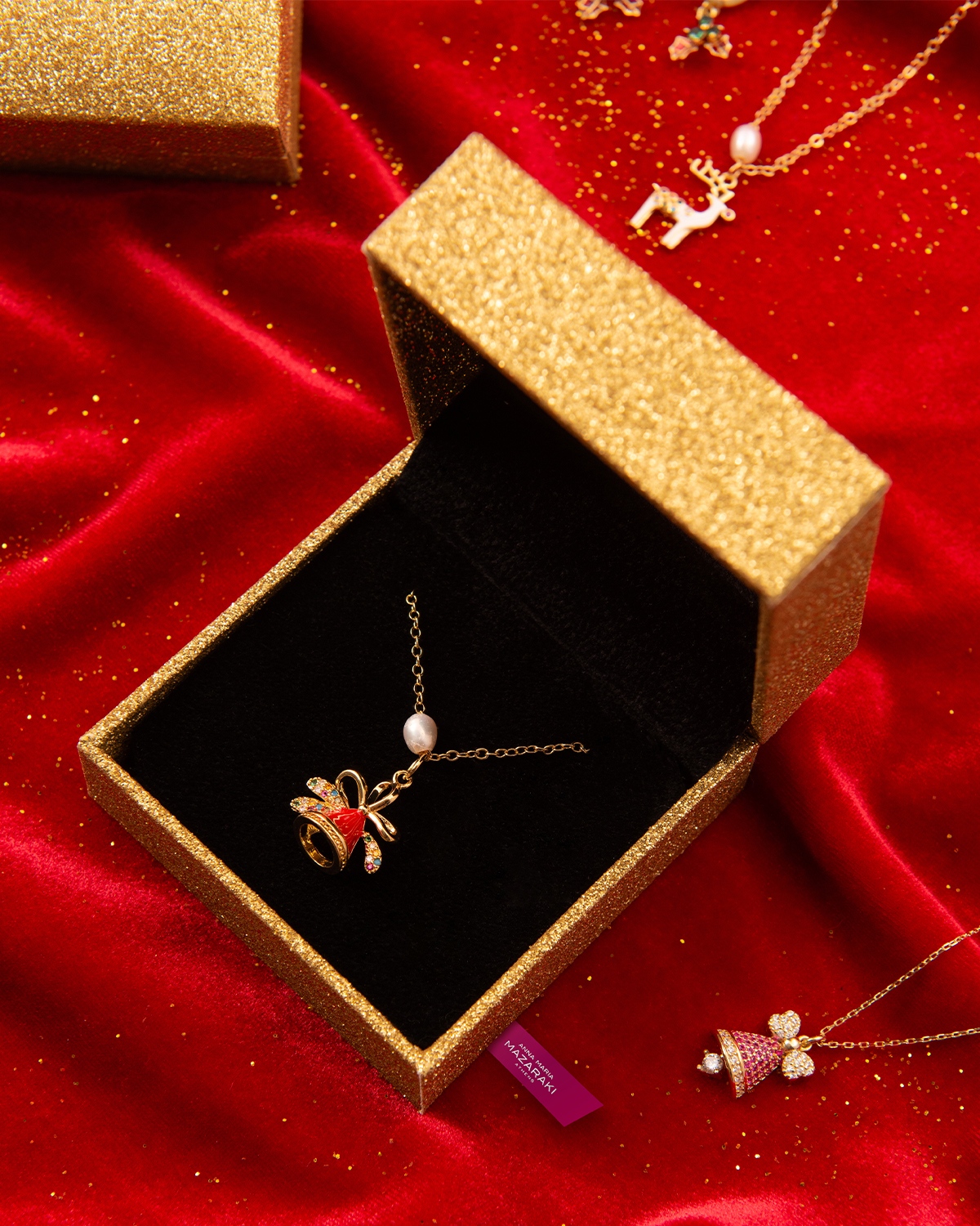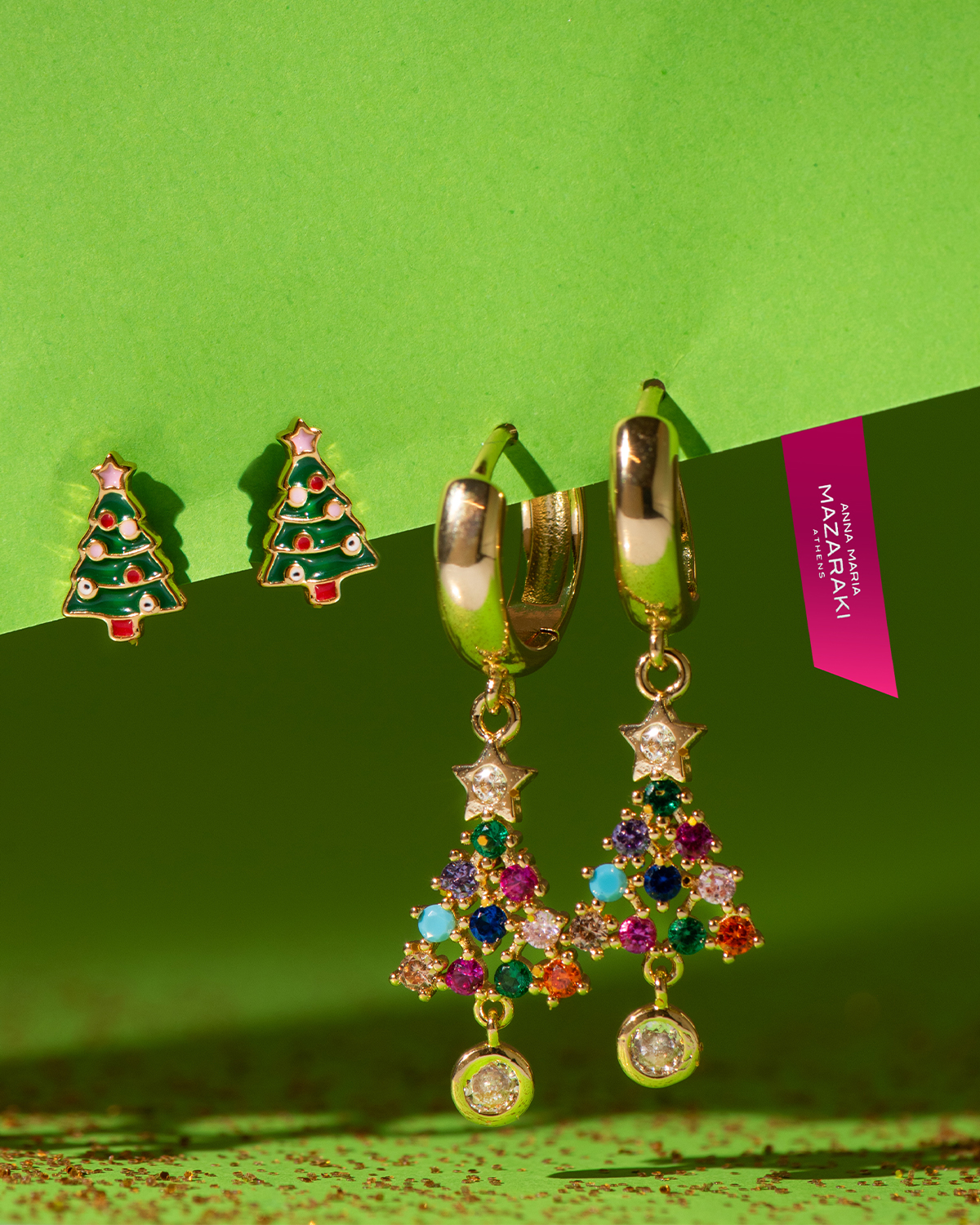 Κολιέ από ορείχαλκο με επιχρύσωμα 24Κ, σε σχήμα γλειφιτζουριού, γιορτινού στεφανιού και ελαφιού, σκουλαρίκια χιονονιφάδες με λευκά ζιργκόν, μικροσκοπικοί χιονάνθρωποι από λευκό σμάλτο, κρίκοι από ορείχαλκο σε σχήμα γκι με πράσινα μονόπετρα και κόκκινο σμάλτο, κολιέ με σχέδιο χριστουγεννιάτικου δέντρου από πολύχρωμα ζιργκόν και μαργαριτάρι, είναι μερικές από τις προσιτές, luxury επιλογές που συνδυάζουν αριστοτεχνικά την απλότητα με την πολυτέλεια και την υψηλή ποιότητα των πιο ανθεκτικών υλικών.