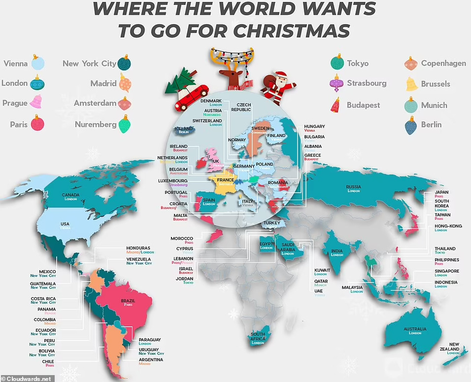 Ο χάρτης δημιουργήθηκε από την ιστοσελίδα Cloudwards.net που καταλήγει στα γιορτινά συμπεράσματα της αφού συνυπολογίσει τους πιο αγαπημένους Χριστουγεννιάτικους προορισμούς που αναφέρονται στα μέσα κοινωνικής δικτύωσης και στις σχετικές αναζητήσεις στην μηχανή της Google.