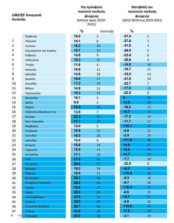 Η χώρας μας, στη νέα έκθεση, καταγράφει σαφή βελτίωση στην αντιμετώπιση της παιδική φτώχειας. Σε σύνολο 40 χωρών βρίσκεται μεν χαμηλά στην κατάταξη (31η) όμως έχει σημειώσει σημαντική πρόοδο μειώνοντας κατά 17% τη παιδική φτώχεια (2014-2021). Το ποσοστό της Ελλάδας βρίσκεται στο 22,3% δηλαδή, δύο στα δέκα παιδιά ζουν σε καθεστώς παιδικής φτώχειας (2019-2021).