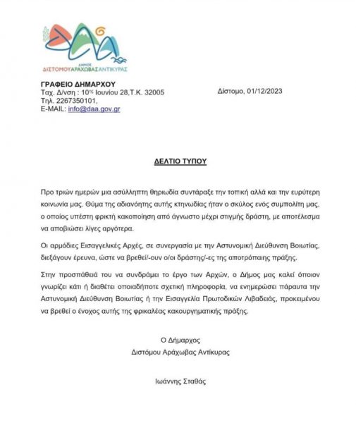 Το δελτίο Τύπου για τον βασανιστικό θάνατο του «Όλιβερ» που εξέδωσε ο δήμαρχος Αράχωβας, Ιωάννης Σταθάς