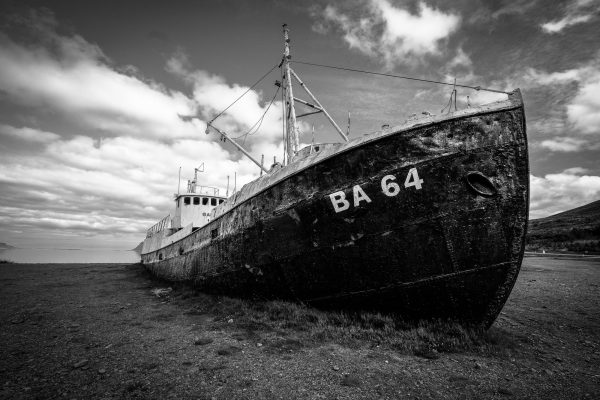 Ασπρόμαυρη φωτογραφία, πλοίο στην στεριά και σύννεφα, όπως αυτά της καταιγίδας που το έβγαλε εξ αρχής εκεί που βρίσκεται.