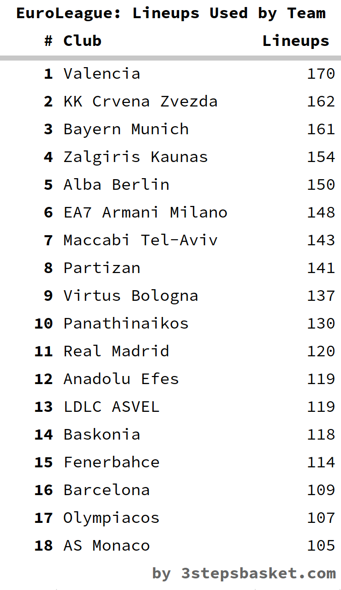 Η Euroleague έχει μια ιδιαίτερη λίστα, σύμφωνα με το «3stepsbasket.com», με τις περισσότερες πεντάδες που έχουν χρησιμοποιήσει οι 18 ομάδες της κορυφαίας διασυλλογικής διοργάνωσης. Ο Ολυμπιακός λοιπόν είναι 17ος, αφού έχει 107 διαφορετικές πεντάδες, την ώρα που στην κορυφή είναι η Βαλένθια με 170 (!).