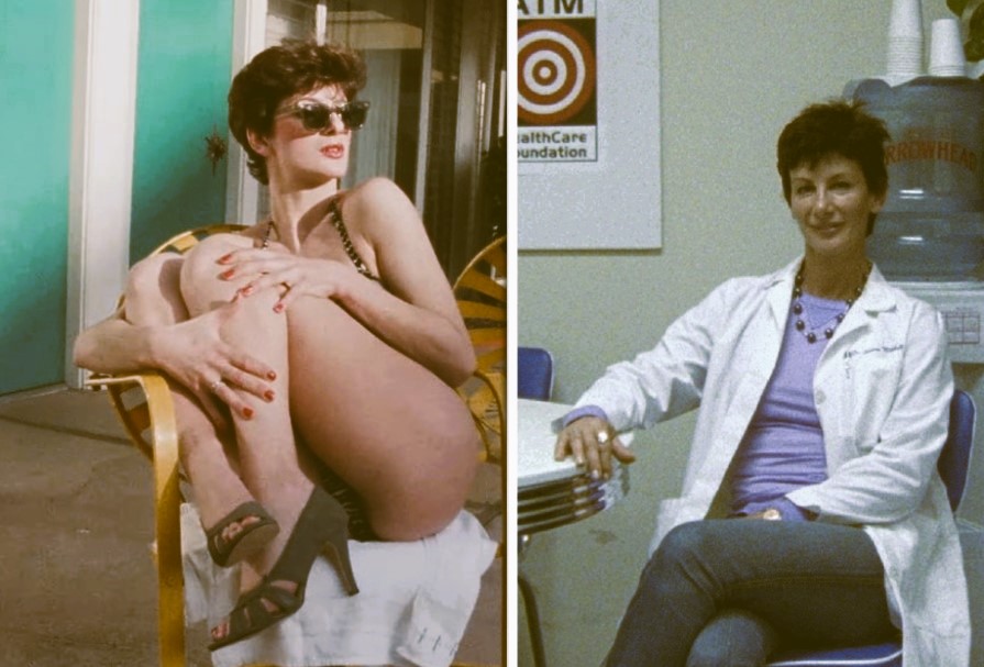 Η Σάρον Μίτσελ δεξιά σε διάρκεια γυρισμάτων τη δεκαετία του 1988 και δεξιά το 2004 ως δρ. σεξολογίας.