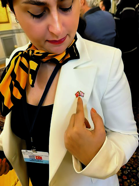 Η διπλωματική συντάκτρια της «Σαμπάχ», που είχε στο πέτο του σακακιού της καρφίτσα με μία τουρκική σημαία και μία του… ψευδοκράτους. Το ζήτημα έλυσαν οι άνθρωποι της τουρκικής πρεσβείας.
