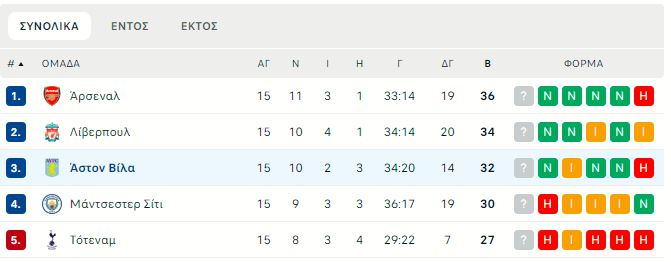 Μετά από 15 αγωνιστικές στη φετινή Premier League η Αστον Βίλα βρίσκεται στην τρίτη θέση της βαθμολογίας, έχοντας συλλέξει 32 βαθμούς (10 νίκες, 2 ισοπαλίες, 3 ήττες).