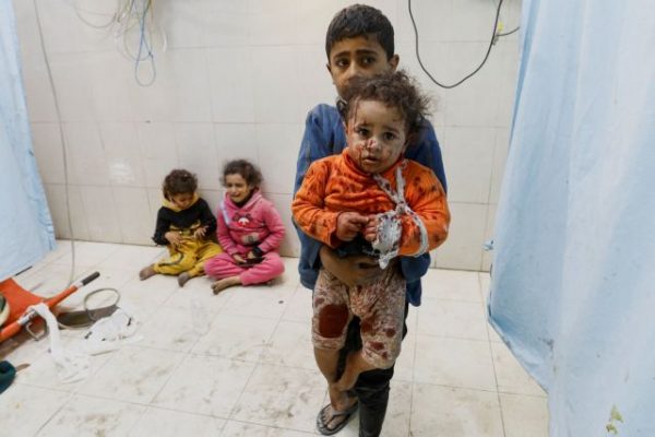 Αγόρι μεταφέρει τραυματισμένο παιδί στο νοσοκομείο Nasser μετά από ισραηλινά χτυπήματα στη Χαν Γιουνίς, στη νότια Λωρίδα της Γάζας (φωτογραφία Reuters/Ibraheem Abu Mustafa)