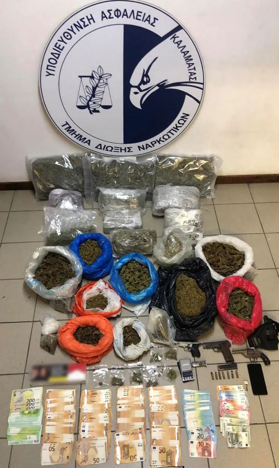 Στα σπίτια τους και σε μια υπόγεια αποθήκη βρέθηκαν μεγάλες ποσότητες κάνναβης, 40.000 ευρώ και τρία πιστόλια.