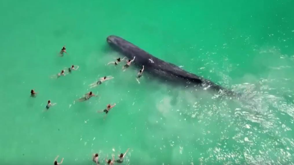 Στις εικόνες, η φάλαινα φαίνεται να έχει φτάσει σε ρηχά νερά και να τραβάει την προσοχή των λουόμενων, πριν επιστρέψει σε βαθιά νερά.