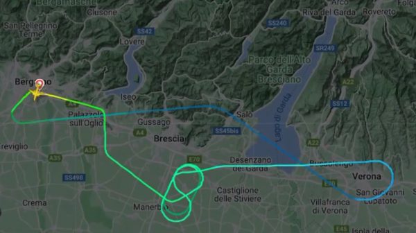Ύστερα από 45 λεπτά καθυστέρησης, τελικά το αεροσκάφος απογειώθηκε, αλλά όπως φάνηκε το πρόβλημα ήταν πιο σοβαρό. Όπως καταγγέλλουν οι επιβάτες, το αεροπλάνο δεν μπορούσε να πάρει ύψος και επί μία ώρα έκανε κύκλους πάνω από την περιοχή του Μπέργκαμο λίγο έξω από το Μιλάνο.