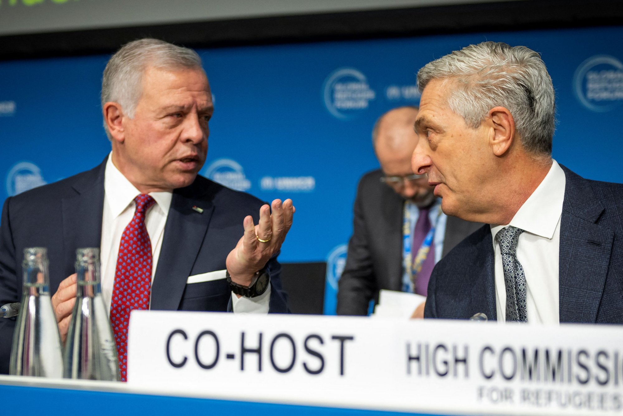 O Ύπατος Αρμοστής των Ηνωμένων Εθνών για τους Πρόσφυγες, Φιλίπο Γκράντι, συνομιλεί με τον βασιλιά Αμπντάλα ΙΙ της Ιορδανίας κατά τη διάρκεια του παγκόσμιου φόρουμ