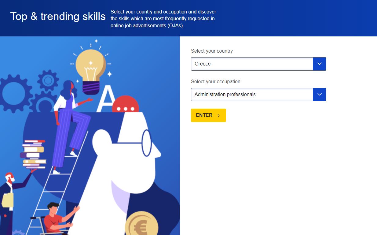 Με την χρήση του νέου ψηφιακού εργαλείου της Eurostat μπορείτε να επιλέξετε ένα επάγγελμα που σας ενδιαφέρει και να δείτε τις δεξιότητες που ζητούνται συχνότερα στις ηλεκτρονικές αγγελίες εργασίας (OJAs) με τα δεδομένα να εξάγονται μεταξύ 2019 και 2022.