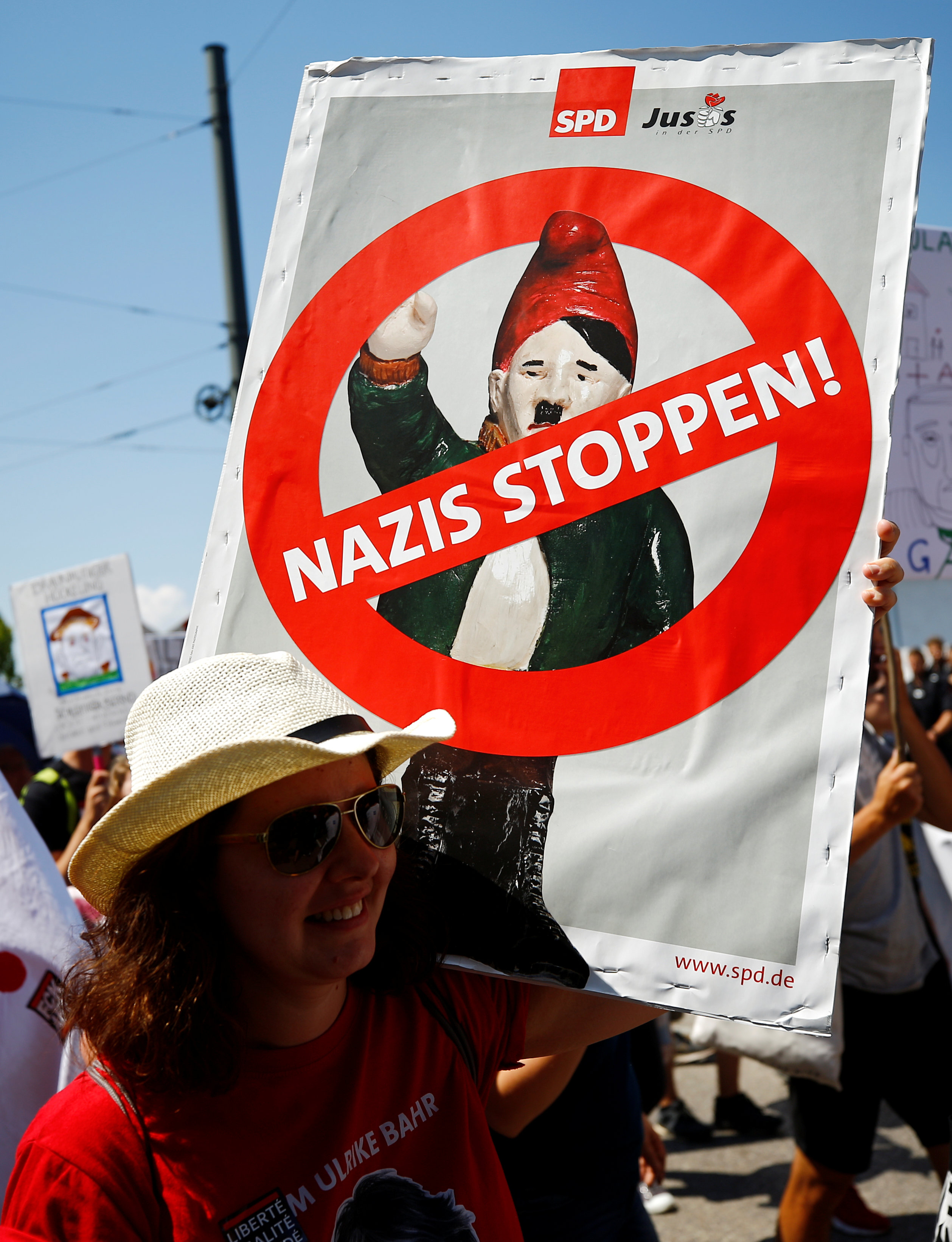 Κόσμος διαδηλώνει καθώς παρευρίσκεται στη διαμαρτυρία κατά του AfD κατά τη διάρκεια του διήμερου συνεδρίου του κόμματος Εναλλακτική για τη Γερμανία (AfD) στο Άουγκσμπουργκ της Γερμανίας, 30 Ιουνίου 2018. Το πλακάτ γράφει «Σταματήστε τους Ναζί». (REUTERS/Βόλφγκανγκ Ράταϊ)