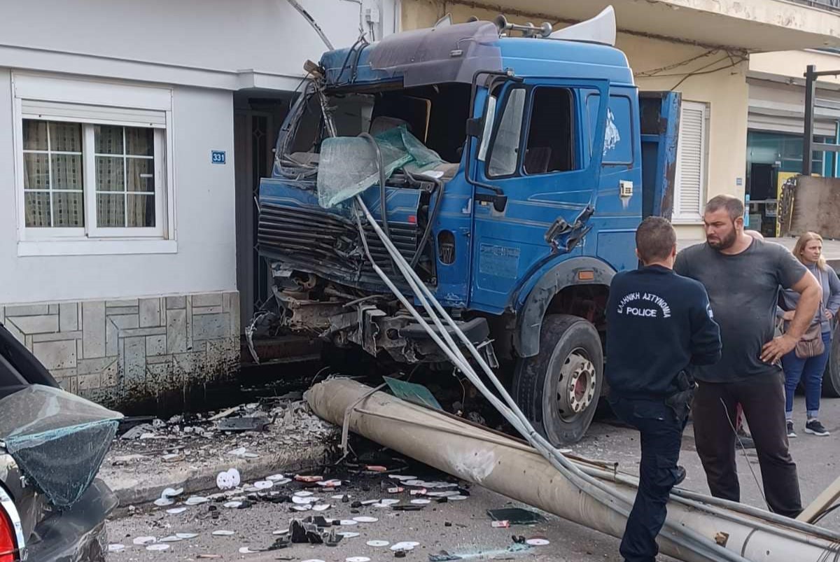 Οδηγός φορτηγού έχασε τον έλεγχο και το βαρύ όχημα καρφώθηκε σε τσιμεντένια κολώνα ηλεκτρισμού.