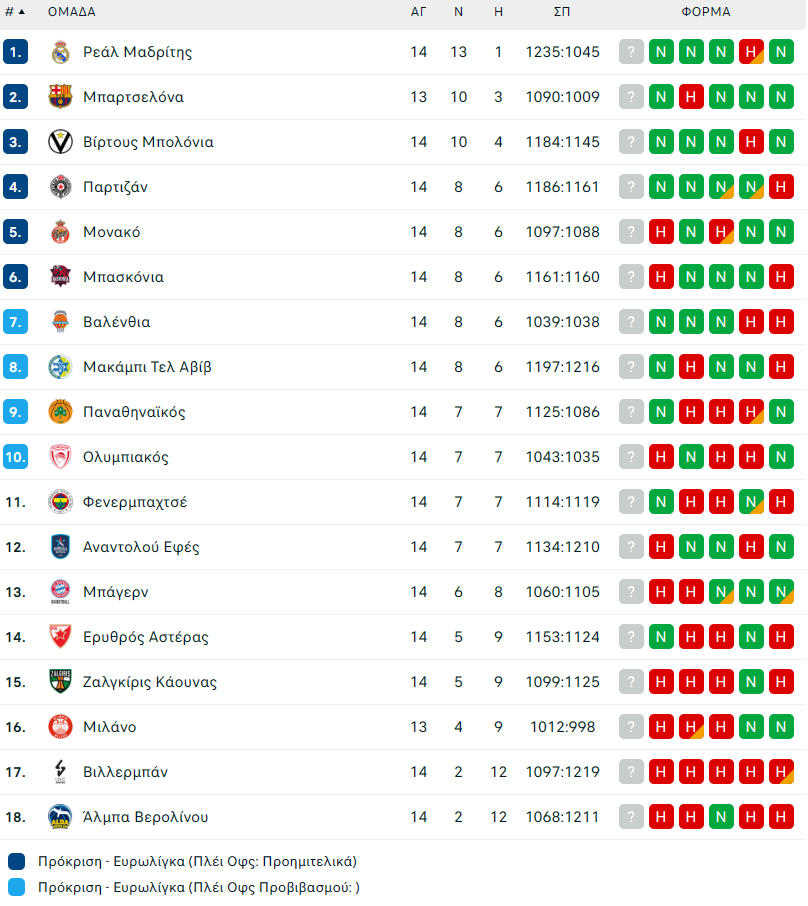 Η βαθμολογία της Euroleague – Που βρίσκονται Ολυμπιακός και Παναθηναϊκός (pic)
