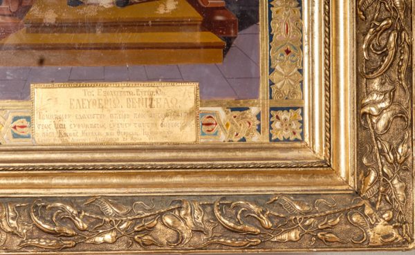 Στο κάτω μέρος της εικόνας, εντός χρυσού πλαισίου, αναγράφονται τα εξής: «Τω Εξοχωτάτω Κυρίω Ελευθερίω Βενιζέλω. Τεκμήριον ελάχιστον απείρου προς αυτόν εκτιμήσεως και ενθυμήσεως ένεκεν ταύτην δωρούσιν οι αδελ. Κοσμάς Μοναχός και Θεόφιλος Ιερομόναχος. Έργον Θέμελη Διονυσίου Αγιογράφου εν Αγίω Όρει 1909».