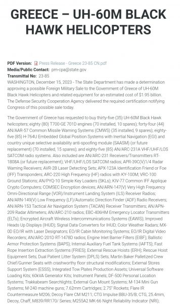 Σύμφωνα με την σχετική επιστολή, η Ελλάδα ζήτησε να αγοράσει 35 ελικόπτερα UH-60M Black Hawk. Το εκτιμώμενο κόστος είναι 1,95 δισεκατομμύρια δολάρια.