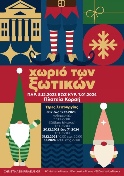 13:00-14:00 «Τα ξωτικά επιστρέφουν στον Πειραιά», Πειραϊκός Σύνδεσμος. Όλο τον χρόνο γυρίζουν τον κόσμο, αλλά κάθε Χριστούγεννα πρέπει να επιστρέψουν στο χωριό τους. Για να δούμε αν μπορούμε να τα δελεάσουμε να εμφανιστούν παίζοντας τα κάλαντα της κάθε χώρας που έχουν πάει.