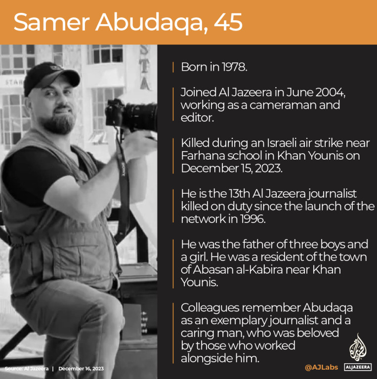 Ο εικονολήπτης του Al Jazeera Samer Abudaqa είναι μεταξύ των 59 και ο τελευταίος Παλαιστίνιος δημοσιογράφος που σκοτώθηκε από το Ισραήλ. Πολλοί άλλοι έχουν τραυματιστεί, συμπεριλαμβανομένου του Wael Dahdouh, επικεφαλής του γραφείου του Al Jazeera στη Γάζα, η οικογένεια του οποίου σκοτώθηκε σε προηγούμενη ισραηλινή επίθεση.