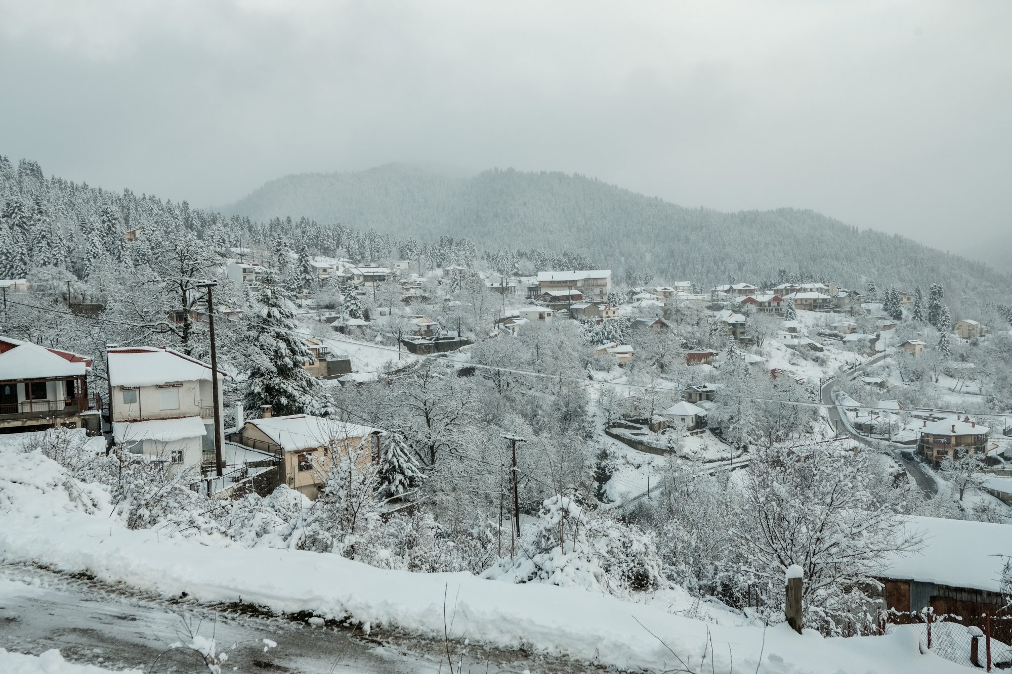 Στη Σαμαρίνα Γρεβενών τα έλατα, τα πεύκα, οι δρόμοι και τα σπίτια καλύφθηκαν από το χιόνι, δημιουργώντας ένα ειδυλλιακό χειμωνιάτικο τοπίο.