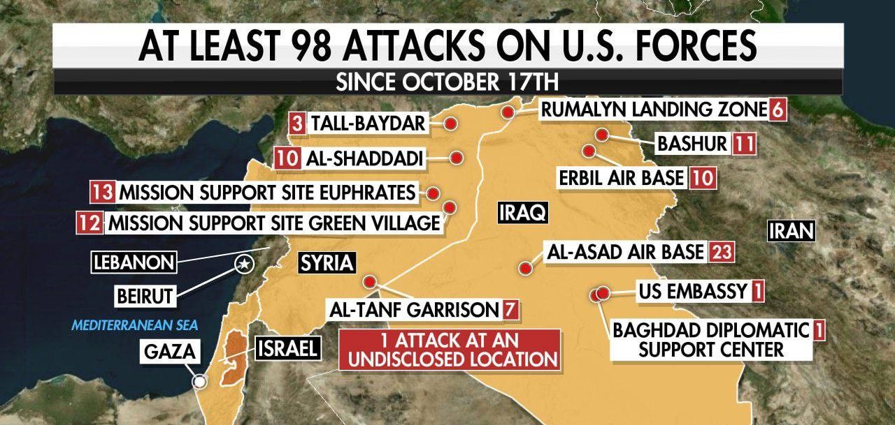Εκκινώντας περίππου 10 μέρες από την έναρξη του πολέμου, οι επιθέσεις αποκλειστικά σε αμερικανικές βάσεις έχουν φτάσει αισίως τις 98