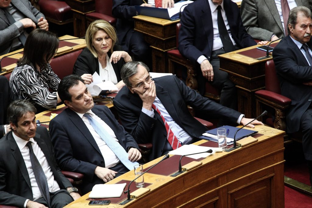 ΑΡΧΕΙΟΥ. Κυριάκος Μητσοτακης, Αδωνις Γεωργιάδης, Αντώνης Σαμαρας. Συζήτηση στη Βουλή σχετικά με την πορεία των διαπραγματεύσεων με τους ευρωπαίους δανειστές, στην Αθήνα, 30 Μαρτίου, 2015