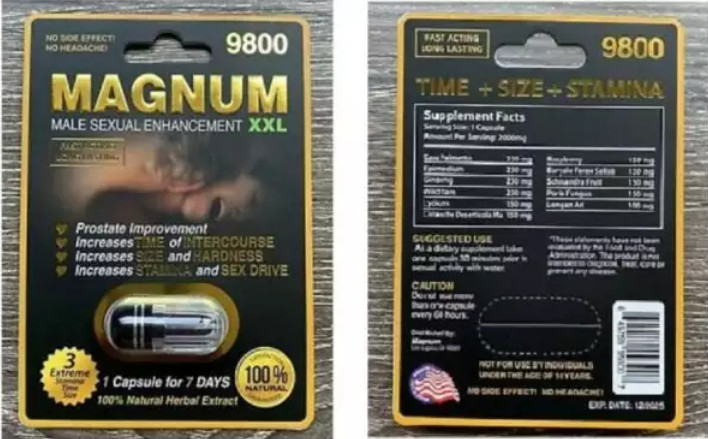 Το συμπλήρωμα διατροφής ονομάζεται Magnum XXL 9800. Τον ΕΟΦ ενημέρωσε η αμερικανική Υπηρεσία Τροφίμων & Φαρμάκων (FDA), καθώς τη σιλδεναφίλη απεκάλυψαν εργαστηριακοί έλεγχοι.