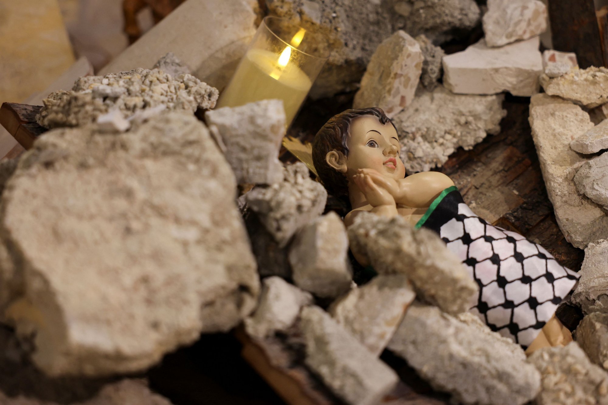 Αντί για μια ποιμενική σκηνή της Γέννησης, η φάτνη παρουσιάζει τον μικρό Ιησού τυλιγμένο σε μια παλαιστινιακή καφίγια, περιτριγυρισμένο από τραχιά κομμάτια πέτρας - θυμίζοντας βομβαρδισμένα κτίρια στη Λωρίδα της Γάζας και παιδιά θαμμένα κάτω από αυτά.