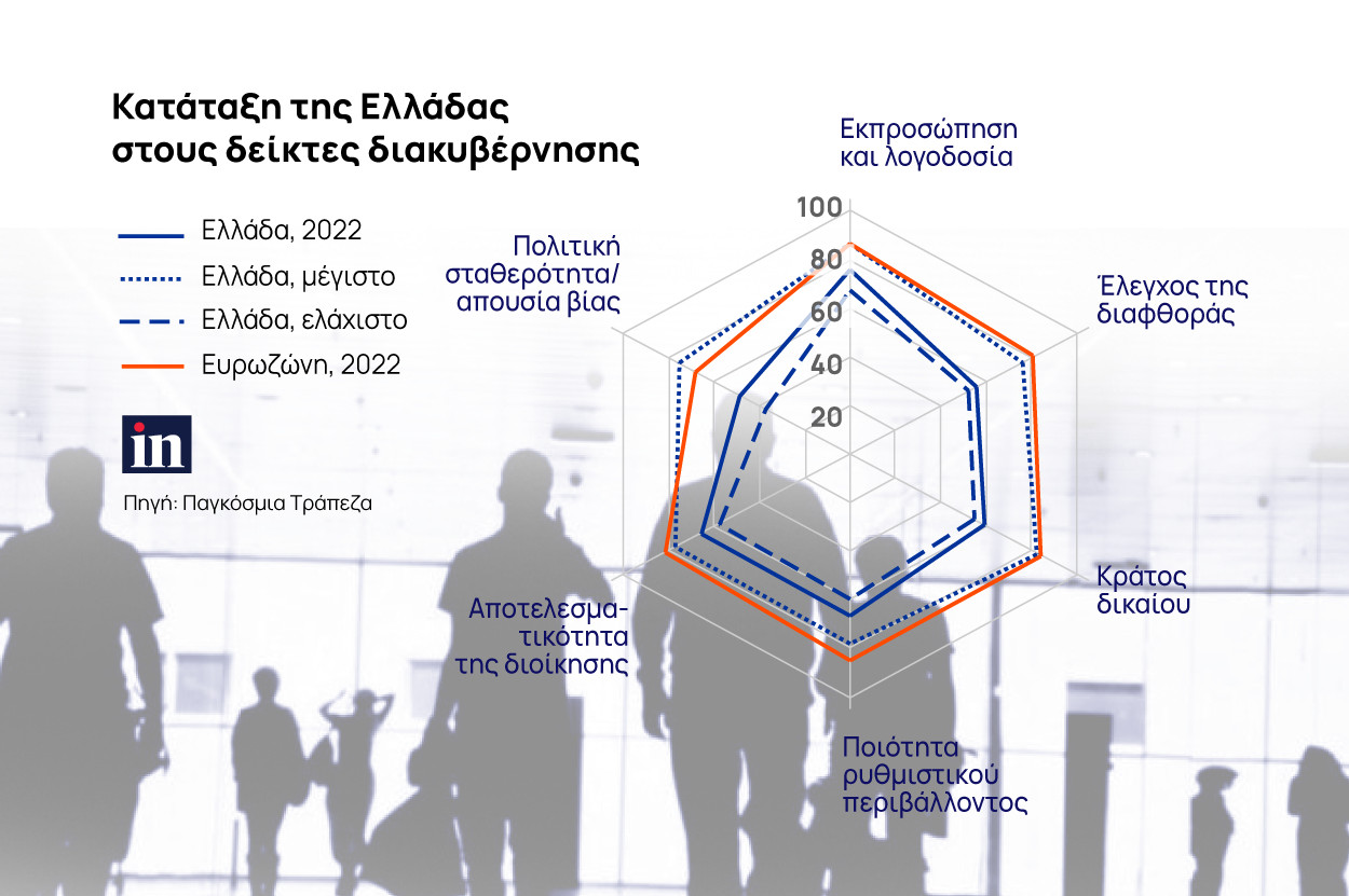 Η μέση κατάταξη της ελληνικής οικονομίας στους δείκτες διακυβέρνησης έχει υποχωρήσει κατά τη διάρκεια της δεκαετίας της κρίσης από επίπεδα πολύ κοντά σε εκείνα του μέσου όρου των οικονομιών της ζώνης του ευρώ σε επίπεδα πλησίον των αναπτυσσόμενων οικονομιών.