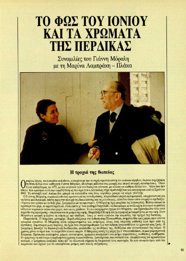 *Απόσπασμα από εκτενέστατο δημοσίευμα του «Ταχυδρόμου» για τον Γιάννη Μόραλη, που έφερε τον τίτλο «Το φως του Ιονίου και τα χρώματα της Πέρδικας» και είχε περιληφθεί στο τεύχος που είχε κυκλοφορήσει στις 26 Μαΐου 1988.