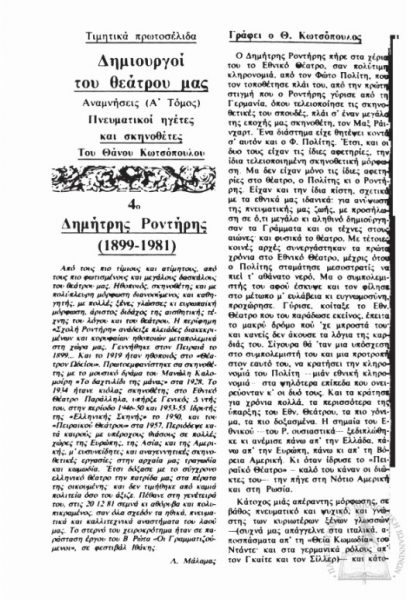 Στο ίδιο τεύχος τού εν λόγω περιοδικού ο σπουδαίος ηθοποιός, σκηνοθέτης και θεατρικός συγγραφέας Θάνος Κωτσόπουλος (1911-1993) έγραφε για τον Ροντήρη τα εξής, μεταξύ πολλών άλλων:
