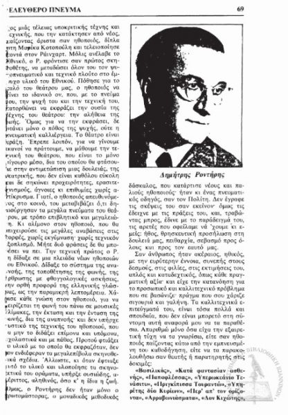 Ο Δημήτρης Ροντήρης πήρε στα χέρια του το Εθνικό Θέατρο, σαν πολύτιμη κληρονομιά, από τον Φώτο Πολίτη, που τον τοποθέτησε πλάι του, από την πρώτη στιγμή που ο Ροντήρης γύρισε από τη Γερμανία, όπου τελειοποίησε τις σκηνοθετικές του σπουδές, πλάι σ’ έναν μεγάλο της εποχής μας σκηνοθέτη, τον Μαξ Ράινχαρτ. Ένα διάστημα είχε θητέψει κοντά σ’ αυτόν και ο Φ. Πολίτης. Έτσι, και οι δυο τους είχαν τις ίδιες αφετηρίες, την ίδια τελειοποιημένη σκηνοθετική μόρφωση. Μα δεν είχαν μόνο τις ίδιες αφετηρίες στο θέατρο, ο Πολίτης κι ο Ροντήρης. Είχαν και την ίδια πίστη σχετικά με τα εθνικά μας ιδανικά: για ανύψωση της πνευματικής μας ζωής, με προσήλωση σε ό,τι μεγάλο κι αληθινό δημιούργησαν τα Γράμματα και οι τέχνες στους αιώνες. Με τέτοιες κοινές αρχές συνεργάστηκαν τα πρώτα χρόνια στο Εθνικό Θέατρο, μέχρις ότου ο Πολίτης σταμάτησε μεσοστρατίς να πιει τ’ αθάνατο νερό. Μα ο συμπολεμιστής του, αφού έσκυψε και τον φίλησε στο μέτωπο μ’ ευλάβεια κι ευγνωμοσύνη, προχώρησε. Γύρισε, κοίταξε το Εθνικό Θέατρο που του παράδωσε εκείνος, έπειτα το μακρύ δρόμο που ’χε μπροστά του· και κανείς δεν άκουσε τα λόγια της καρδιάς του. Σίγουρα θα ’ταν μια υπόσχεση στο συμπολεμιστή του και μια προτροπή στον εαυτό του, να κρατήσει την κληρονομιά του Πολίτη —μιαν εθνική κληρονομιά— στα ψηλότερα επίπεδα που ονειρεύονταν κ’ οι δυο τους. Και τα κράτησε για χρόνια πολλά, τα περισσότερα της ύπαρξης του Εθνικού Θεάτρου, τα πιο γόνιμα, τα πιο δοξασμένα. Η σημαία του Εθνικού — του Ροντήρη ουσιαστικά— ξεδιπλώθηκε κι ανέμισε πάνω απ’ την Ελλάδα, πάνω απ’ την Ευρώπη, πάνω κι απ’ τη Βόρεια Αμερική. Κι όταν ίδρυσε το «Πειραϊκό Θέατρο» —καλό τού κάναν οι διώκτες του— την πήγε στη Νότιο Αμερική και στη Ρωσία.