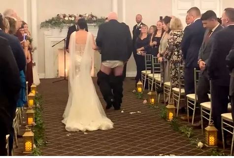 Μια αρκετά αμήχανη στιγμή καταγράφηκε σε έναν γάμο. Την ώρα που η νύφη συνοδευόταν από τον πατέρα της στην εκκλησία, το παντελόνι του έπεσε και αποκάλυψε το εσώρουχό του.
