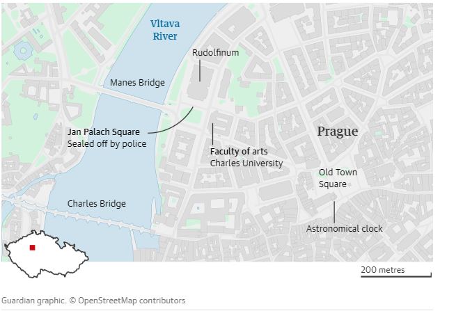 Η επίθεση σημειώθηκε στη Σχολή Καλών Τεχνών, πολύ κοντά σε σημαντικά τουριστικά αξιοθέατα, όπως η Γέφυρα του Καρόλου, του 14ου αιώνα.