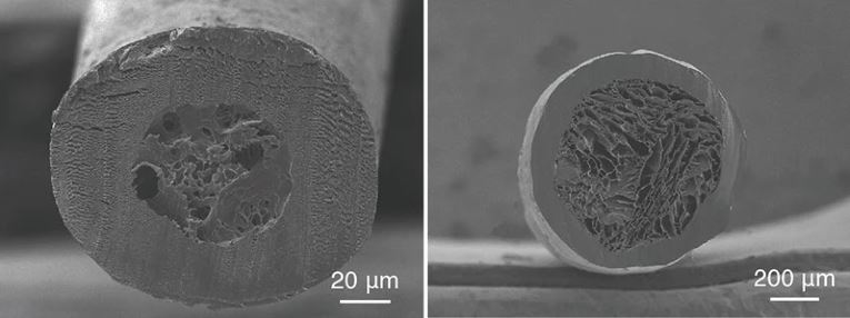 Διατομή μιας τρίχας πολικής αρκούδας (Α) και μιας ίνας αερογέλης (Wu et al./Science)