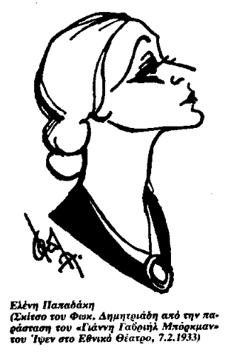 Μόλις εφτά χρόνια είχαν περάσει από τότε που η Ελένη Παπαδάκη, νεαρός μίσχος ακόμα, είχε θαμπώσει το αθηναϊκό κοινό με τις πρώτες ερμηνείες της και, προπάντων, με την Προγονή στο πιραντελλικό «Έξι πρόσωπα ζητούν συγγραφέα», στο «Θέατρον Τέχνης» του Σπύρου Μελά (Ιούνιος 1925). Αλλά ήταν κιόλας ομόφωνα αναγνωρισμένη σαν μια απ’ τις πιο άλκιμες δυνάμεις του Θεάτρου μας, με τις πιο πολύχυμες δυνατότητες. Εκεί, στη σκηνή του Εθνικού, με τον Φώτο Πολίτη στην αρχή, με τον Δ. Ροντήρη έπειτα, έδειξε πόσο ήταν το «μέγεθός» της και πόσο θα μπορούσε να μεγεθυνθεί ακόμα — αν δεν θρυμματιζόταν έτσι απότομα κι απαίσια κι αναίτια.