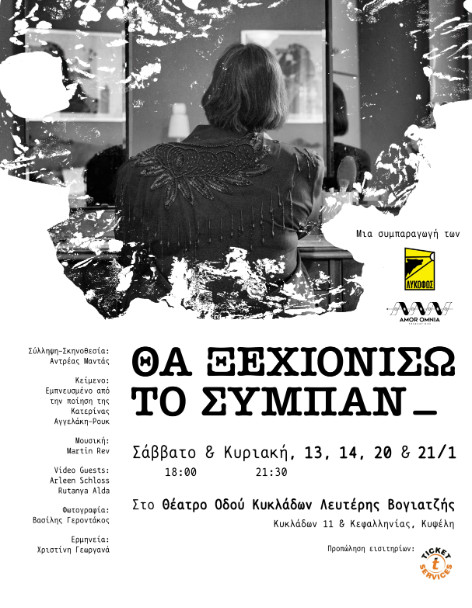 Μια παράσταση αφιερωμένη στην ποίηση και την προσωπικότητα της Κατερίνας Αγγελάκη-Ρουκ, με το κείμενο να είναι ευθέως εμπνευσμένο από το ιδιαίτερο ύφος της μεγάλης ποιήτριας, και με αναφορές σε θραύσματα της ποίησής της θα παρουσιαστεί από τις 13 Γενάρη στο Θέατρο Της Οδού Κυκλάδων «Λευτέρης Βογιατζής». Η ομάδα Amor Omnia με την παράσταση της «Θα Ξεχιονίσω Το Σύμπαν» σε σκηνοθεσία του Αντρέα Μαντά που υπογράφει και το πρωτότυπο κείμενο.