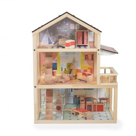 Το σπίτι έχει τρία επίπεδα, μπαλκόνι, παράθυρα οροφής και έπιπλα, είναι πλήρως συναρμολογημένο και έτοιμο να φέρει την χαρά.