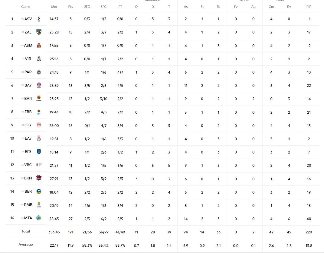 Έτσι κι αλλιώς είναι… τοπ δημιουργός, ενώ έχει ένα μοναδικό ταλέντο και στην εκτέλεση, κάτι που φαίνεται και από τους μέσους όρους του. Στα πρώτα 16 παιχνίδια μετράει 11,9 πόντους ανά ματς, μαζί με 5,9 ασίστ, 2,4 ριμπάουντ και 13,8 στο σύστημα αξιολόγησης, αψηφώντας την ηλικία του, ενώ αγωνίζεται 22 λεπτά περίπου.