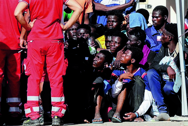 Mετανάστες και πρόσφυγες συγκεντρωμένοι σε κέντρο υποδοχής μεταναστών στο νησί Λαμπεντούζα της Σικελίας