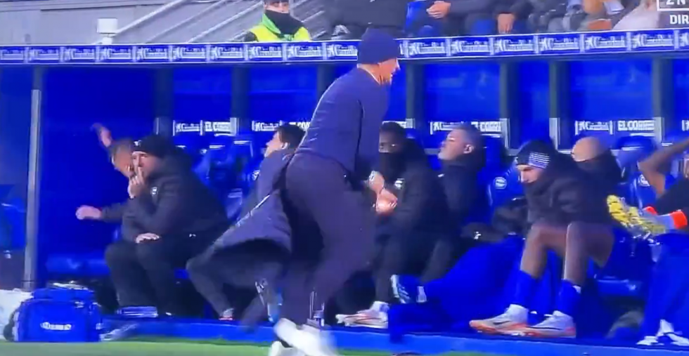 Ο τεχνικός των γηπεδούχων δευτερόλεπτα μετά το γκολ της Ρεάλ εξερράγει, βλέποντας την ομάδα του να χάνει και τον βαθμό της ισοπαλίας.