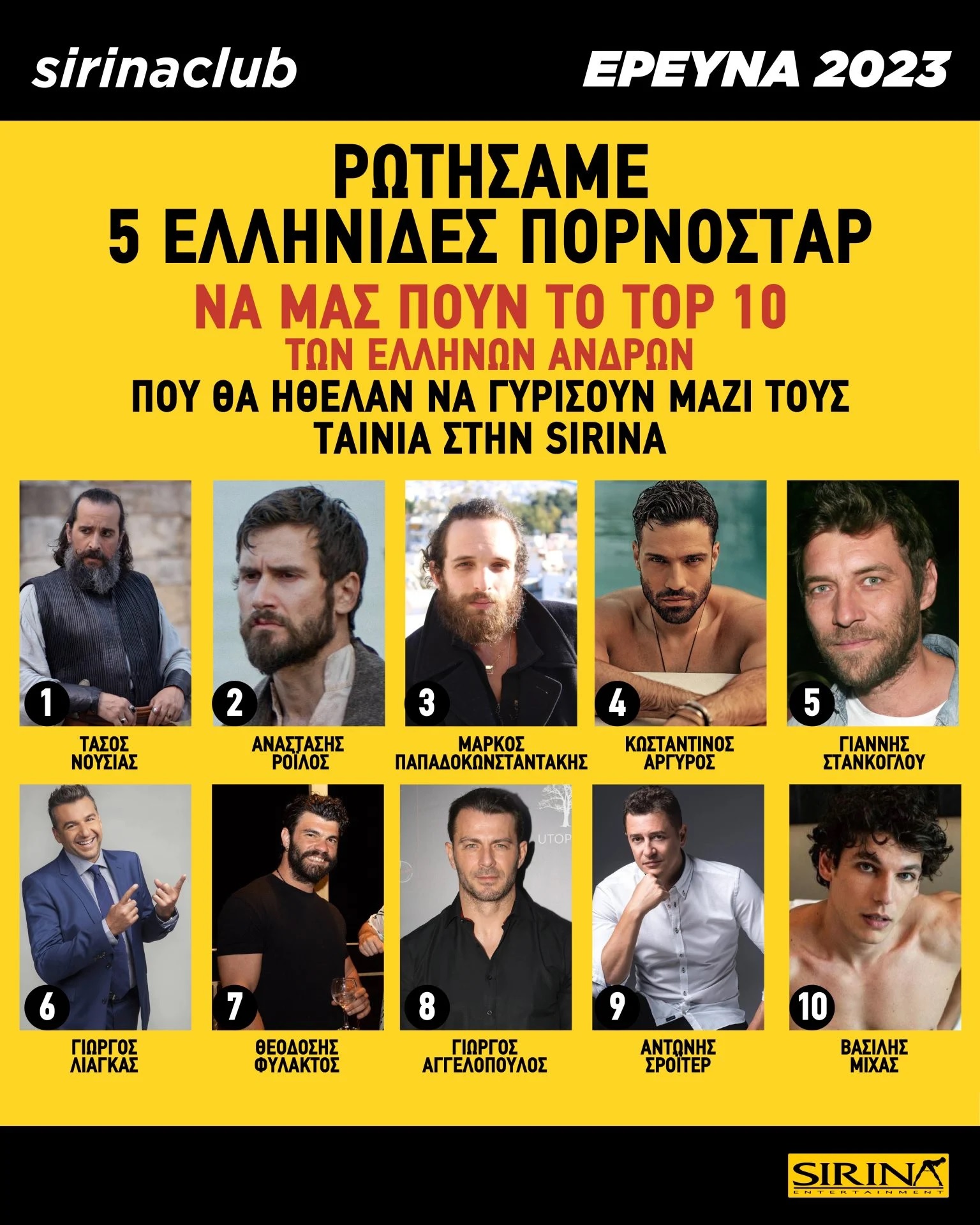 Συγκεκριμένα, στο ερώτημα με ποιον διάσημο Έλληνα θα ήθελαν να γυρίσουν ταινία στη Sirina, οι πέντε κορυφαίες σταρ της εταιρίας ως πρώτη τους επιλογή έχουν τον Τάσο Νούσια, με τον Αναστάση Ροϊλό να ακολουθεί σε απόσταση αναπνοής.