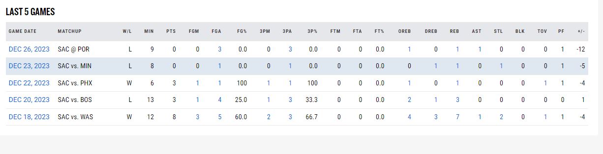 Όπως θα δείτε και στο πίνακα σε όλα τα παιχνίδια έχει κινηθεί (αναπόφευκτα) σε πολύ χαμηλά επίπεδα με εξαίρεση αυτό κόντρα στους Γουίζαρντς, που είχε 8 πόντους με 2/3 τρίποντα και οι Κινγκς πανηγύρισαν τη νίκη. Αξίζει να σημειωθεί πως ο Βεζένκοφ τη φετινή σεζόν μετράει συνολικά 5,3 πόντους, 2,7 ριμπάουντ, 0,5 ασίστ και 7,9 στο σύστημα αξιολόγησης, ενώ στο τελευταίο παιχνίδι κόντρα στους Μπλέιζερς σήμερα τα ξημερώματα, όπου οι Κινγκς ηττήθηκαν, έπαιξε 9 λεπτά, είχε 0 πόντους και έπαιξε όταν όλα είχαν κριθεί.