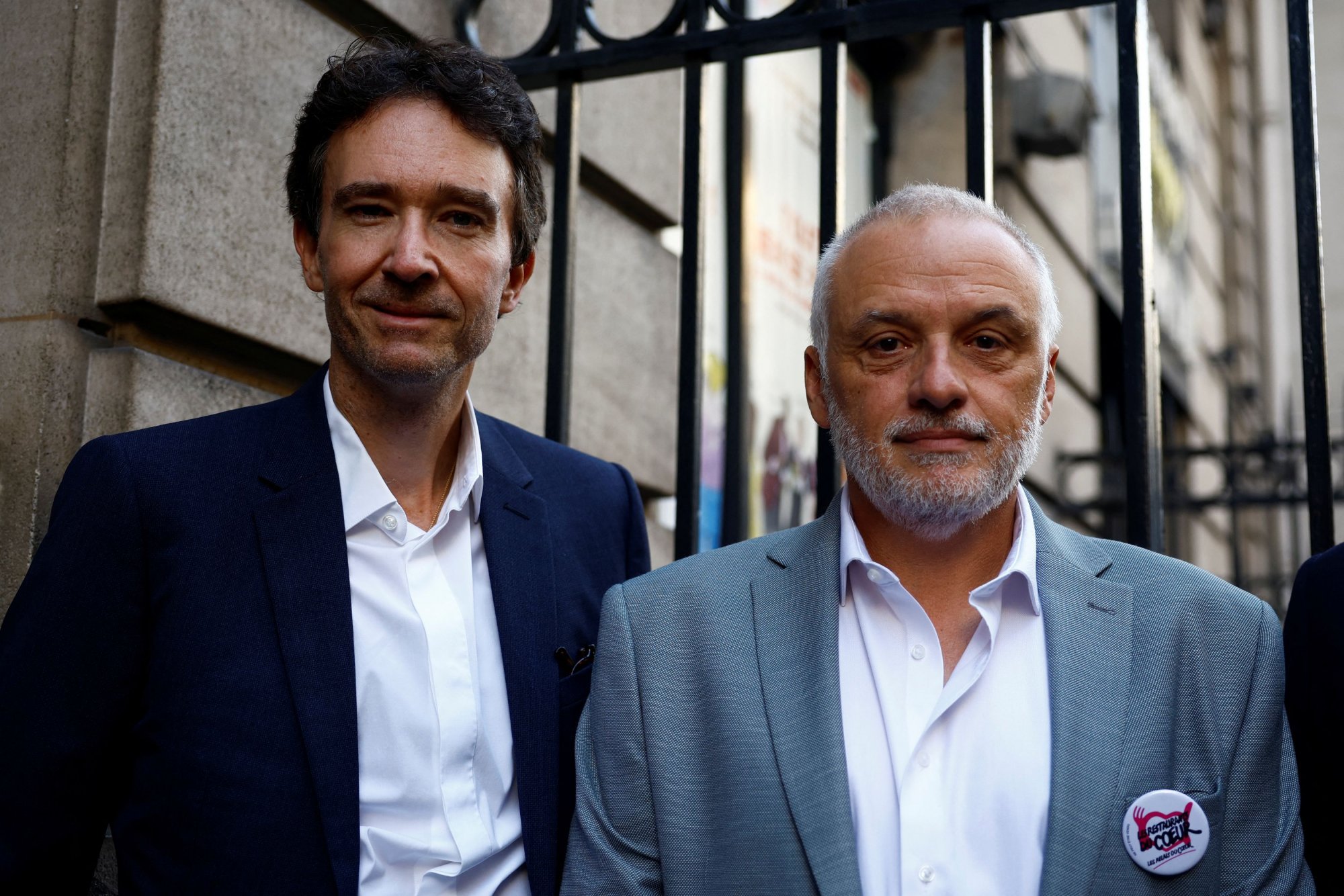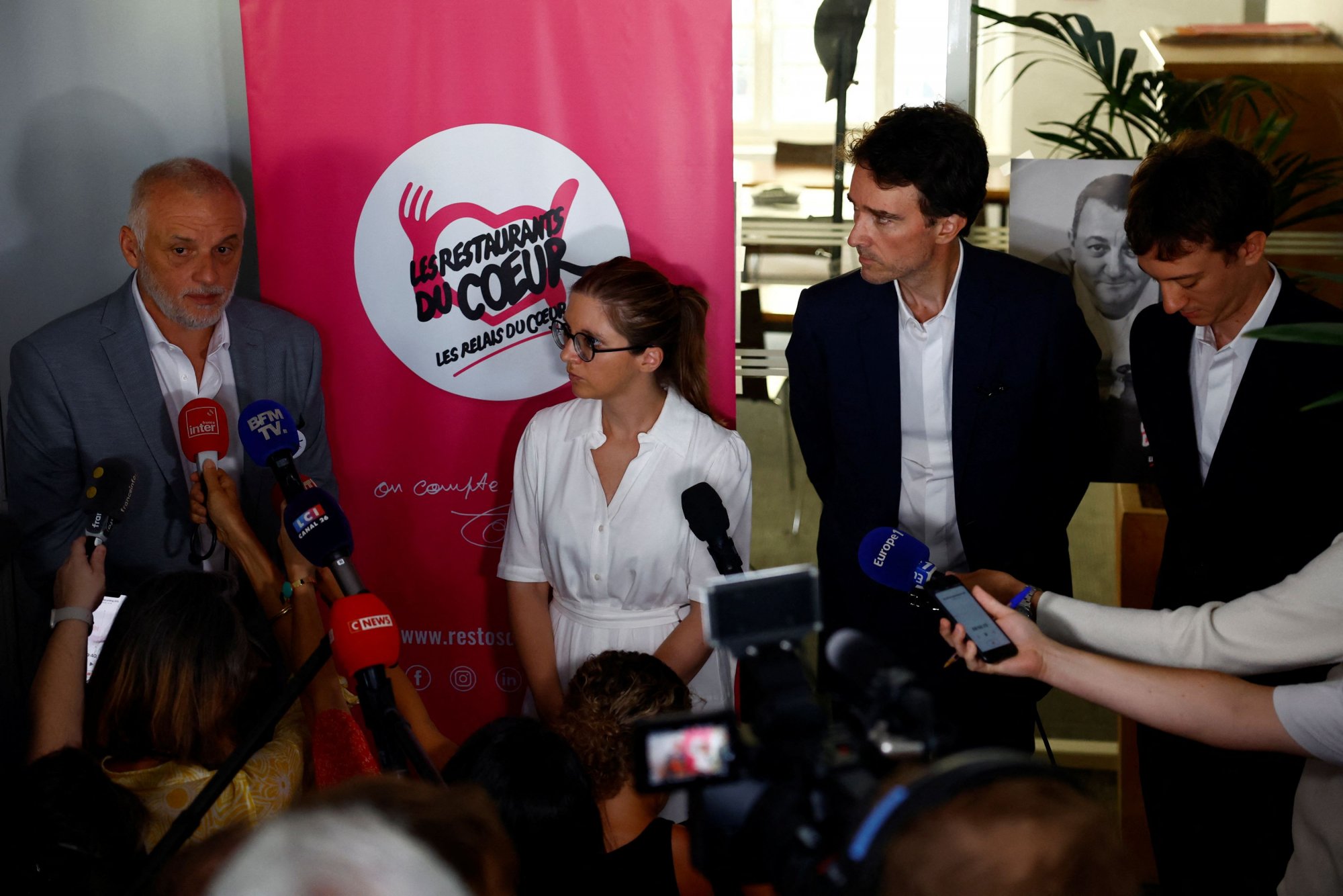 Από αριστερά: Ο Πρόεδρος της Les Restos du Coeur Patrice Douret, η Γαλλίδα υπουργός Αλληλεγγύης και Οικογένειας Aurore Berge και ο γιος του Μπερνάρ Αρνό, Αντουάν Αρνό.