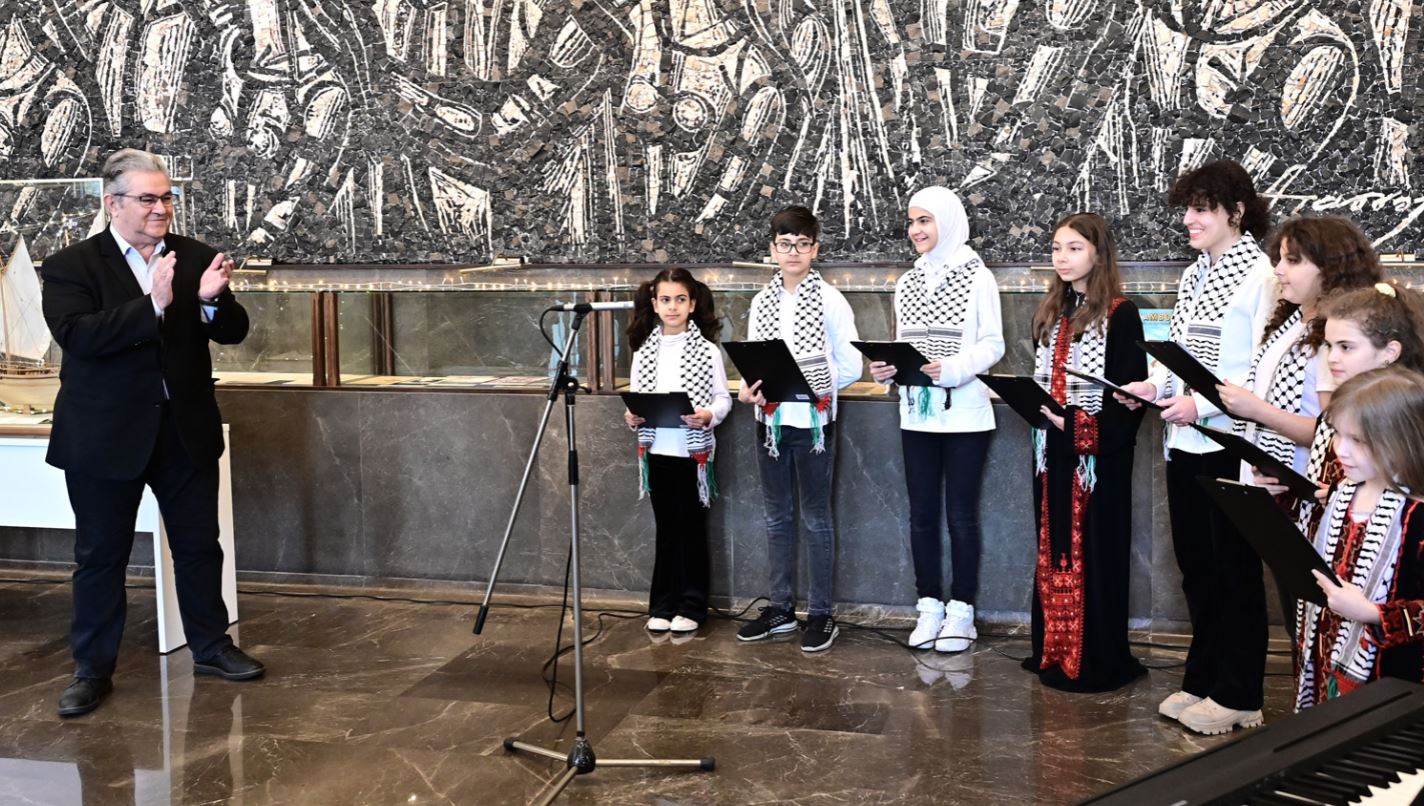 Η παιδική χορωδία της Παλαιστινιακής Παροικίας Ελλάδας έψαλλε τα πρωτοχρονιάτικα κάλαντα στον γενικό γραμματέα της Κεντρικής Επιτροπής του ΚΚΕ, Δημήτρη Κουτσούμπα, το πρωί του Σαββάτου 30 Δεκεμβρίου, στην έδρα του κόμματος στον Περισσό.