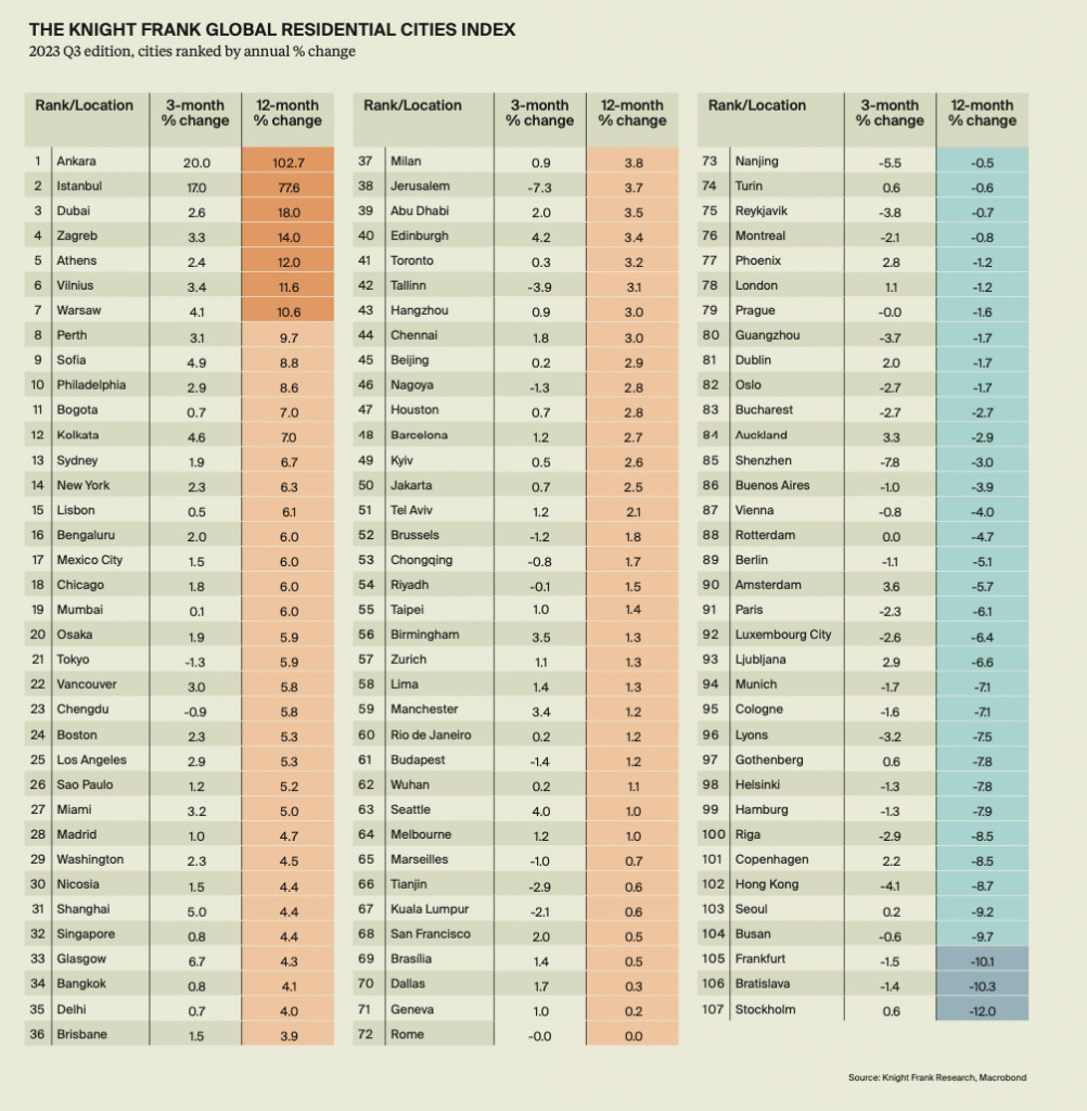 Στην 5η θέση παγκοσμίως κατατάσσει την αγορά ακινήτων της Αθήνας η Knight Frank, η οποία εξετάζει 107 μεγαλουπόλεις του πλανήτη, με τις τιμές των κατοικιών στην ελληνική πρωτεύουσα να αυξάνουν κατά 2,4% το τρίτο τρίμηνο του 2023.